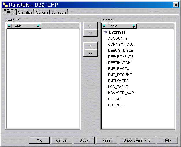 Figure 9 11 Selecting tables for RUNSTATS command